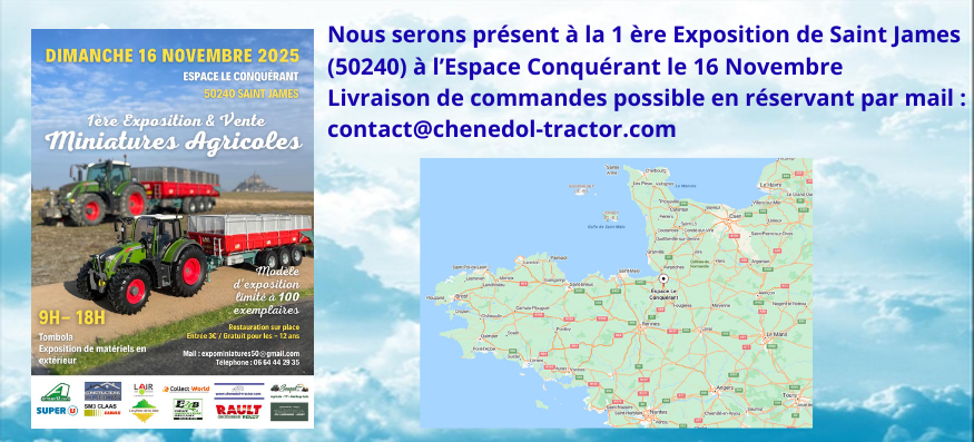 Chenedol Tractor, c'est le spécialiste de la miniature agricole. Le site internet des collectionneurs de miniatures agricoles et d'accessoires pour dioramas fait par un collectionneur. Retrouvez sur notre site internet, une large sélection de tracteurs 1/32ème de toutes les marques (CLAAS, Case IH, Deutz, Renault...) également un large choix de dioramas (Arbres, personnages..)